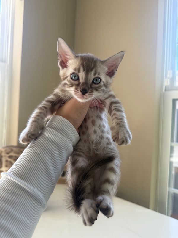 Gorgeous charcoal boy with turquoise eyes. This guy is perfect for a family who wants a sweet loving boy he is the most perfect match. Show quality bengal for $3000 USD. Email us for breeder pricing.